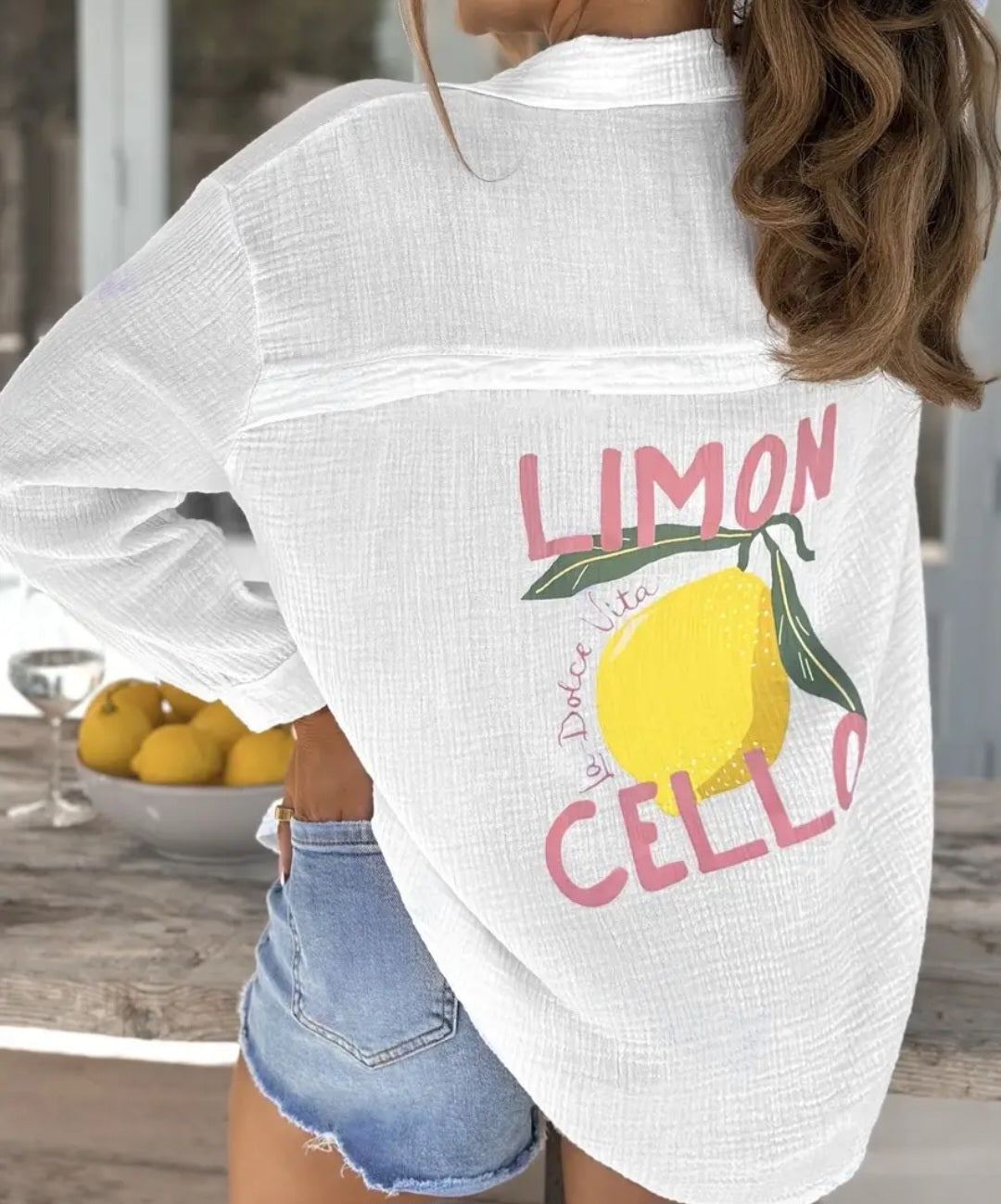 Diese stylische Musselinbluse ist der perfekte Begleiter für alle, die es luftig und leicht mögen! Mit ihrem coolen "Limoncello"-Print auf der Rückseite bringt sie einen Hauch italienisches Flair in deinen Kleiderschrank